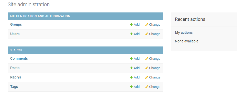 관리자에 모델이 잘 등록되었는지 cmd 창에서 서버를 실행시켜 (python mange.py runserver) 관리자 페이지(127.0.0.1:포트번호/admin/)에 접속하자. 참고로 그전에 관리자 계정을 만드는 것을 잊지 말자. 관리자 계정 만드는 방법은 여기 포스팅을 참고하길 바란다. 그리고 처음 설정시에 mysite2/setting.py에 'search.apps.SearchConfig'를 작성하여 앱을 인식시켜줘야 이와 같이 관리자 화면에서 등록한 모델을 확인할 수 있다.