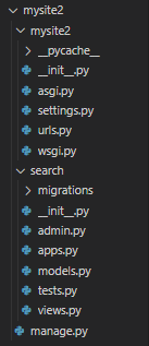 프로젝트 생성과 데이터 베이스 연동과 관련된 자세한 내용은 이전 포스팅을 참고하길 바란다. 나는 프로젝트 이름을 'mysite2', 앱 이름을 'search'로 정의하였다. 프로젝트와 앱 생성 후 파일 구조는 아래와 같다.