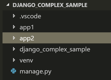 프로젝트로써 django_complex_sample이라는 것을 만들고 그 안에 app1, app2라는 어플리케이션을 만들었다.