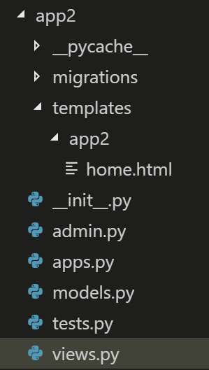 예를 들어, app2의 templates바로 아래에 home.html을 두었다. app1에서의 같은 폴더는 아무것도 두지 않고 비워두었다. 그리고 app1의 뷰(view)에서 템플릿 명 home.html을 지정한다.