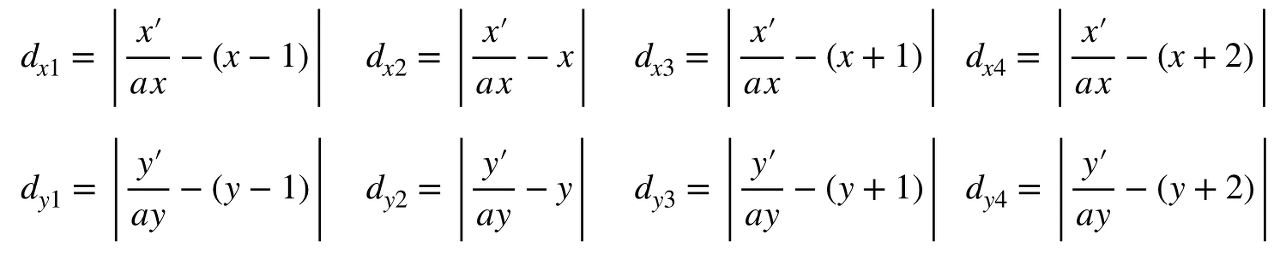 3. 각각의 화소와 (x'/a, y'/a)와의 거리 d를 구해 가중치를 부여한다. w = d / Sum d