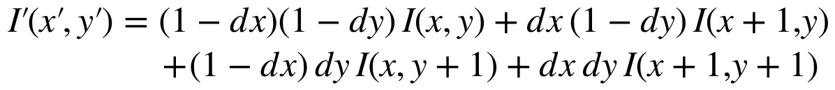 out = (1-dx) * (1-dy) * img[iy, ix] + dx * (1 - dy) * img[iy, ix+1] + (1 - dx) * dy * img[iy+1, ix] + dx * dy * img[iy+1, ix+1]