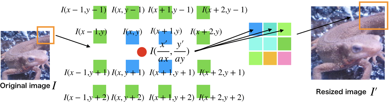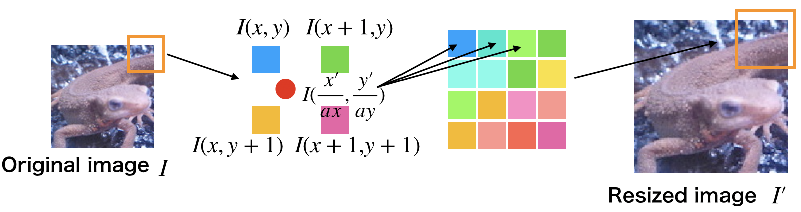 2. 원본 이미지의 (x'/a, y'/a)의 주변 4화소인 I(x,y), I(x+1,y), I(x,y+1), I(x+1, y+1)를 구한다.