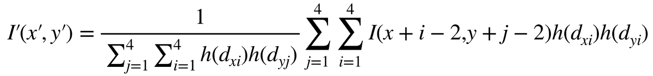 위의 화소의 가중치를 사용해, 다음의 식으로 확대 이미지의 화소가 계산된다.