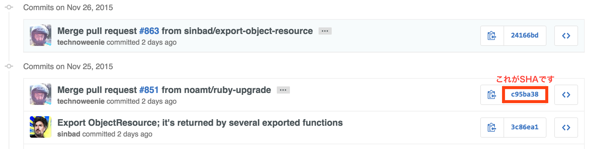 SHA만 알면, 그 커밋 끼리의 변경점도 확인할 수 있다. SHA란 GitHub의 커밋 목록에 표시되어 있는 아래의 빨간 네모 박스이다.