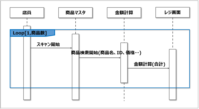 루프 처리(반복 처리)는 'loop'라는 복합 프래그먼트로 표현한다. 루프의 횟수는 [시작 조건, 종료 조건]이라는 형식으로 기재된다.