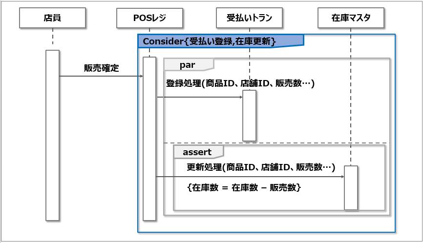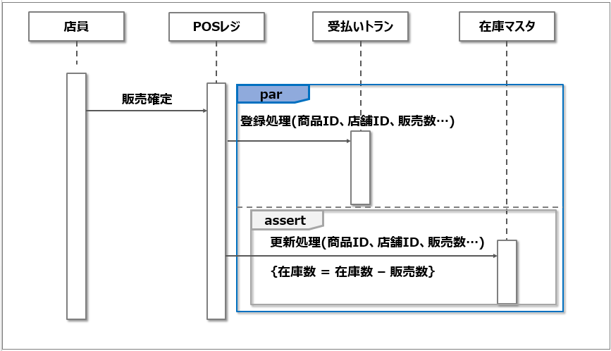 병렬처리는 'par' 복합 프래그먼트를 사용하여 표현한다. 병렬으로 실행된 처리는 점선으로 구분한다. 아래의 그림은 작은 상점에서 점포 재고의 갱신을 표시하는 예이다. 판매 확정시에 결제 트랜스와 재고 마이너스가 동시에 갱신되어야 한다.