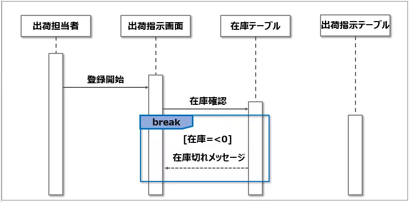 중단 처리는 'break'라는 복합 프래그먼트로 표시한다. 중단조건은 가드라는 [] 괄호 안에 기재한다.