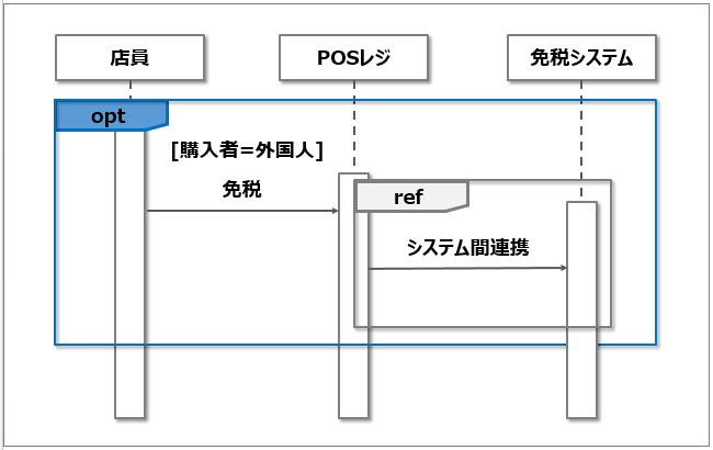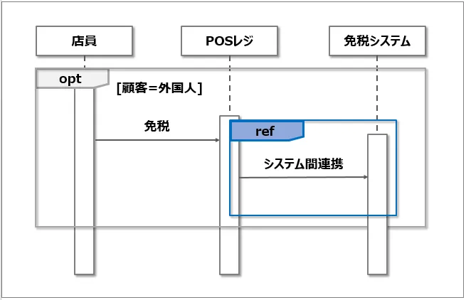아래의 그램은 면세점의 면세대상을 표시한 예이다. POS레지와 면세 시스템의 연동 처리는 복잡하므로 다른 시퀀스 다이어 그램에서 상세히 표시하고 있다는 것을 알려주고 있다.