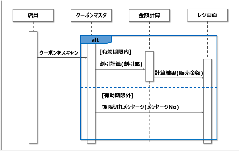조건 분기를 표시할 때는 'alt' 복합 프래그먼트를 사용하여 표시한다. 분기의 조건은 [] (가드라고 불리는 괄호) 내에 기재하고 각 처리를 점선에 나눠서 작성한다.