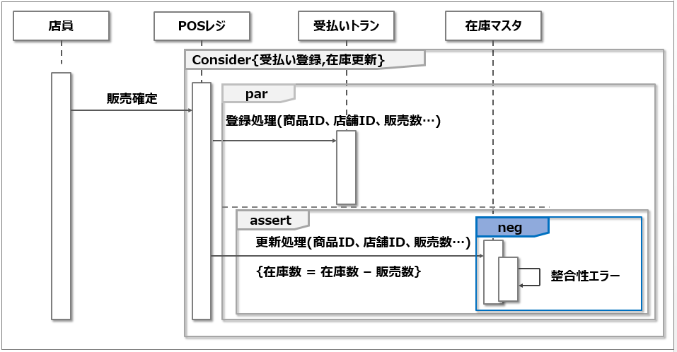 아래의 그림은 판매 확정시의 결제 트랜스와 재고 마스크의 갱신 처리를 표시한 예이다. 재고 마스크는 '재고 수 = 재고 수 - 판매수'라는 로직으로 갱신되지만, 무언가 문제가 발생하여 정합성을 얻을 수 없어 갱신되지 않을 때에 정합성 에어 처리를 실시한다.