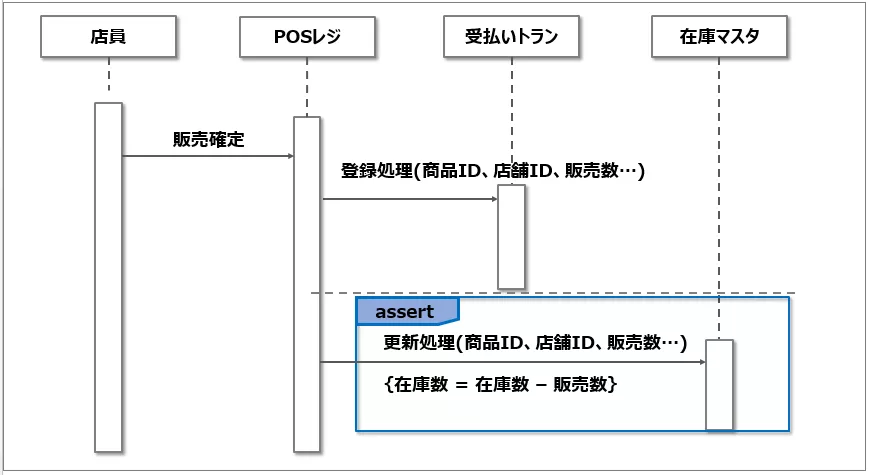 아래의 그림은 작은 가게에서 점포 재고의 갱신처리는 표시한 예이다. 판매확정시에 결제 트랜스와 재고 테이블을 반드시 갱신해야하는 처리를 표시하고 있다.