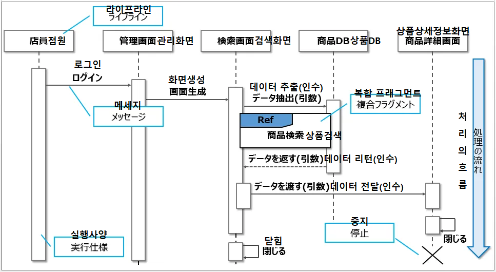 아래의 그림은 점원(店員)이 상품(商品)을 검색하고 상품의 상세 정보를 참고하는 시퀀스 다이어그램의 예이다.