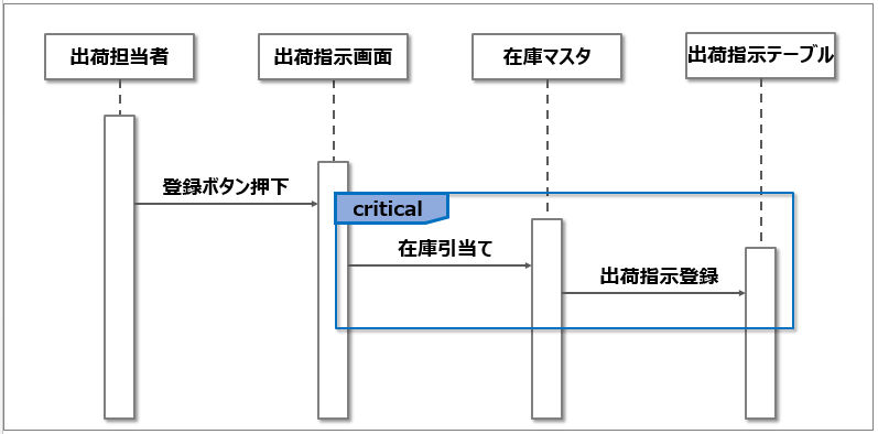아래의 그림은 출하 지시 등록시에의 재고 마스트와 출하시정 테이블의 갱신 처리이다. 데이터의 정합성을 담보하기 위해서 재고 마스크와 출하 지정 테이블의 갱신 대상 레코드에 베타 처리를 실행한다.