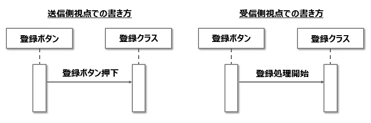 메시지를 받는 쪽의 관점에서 작성할 것인가, 송신하는 쪽의 시점에서 작성할 것인가를 정의해두자. 메시지의 작성법을 명확히 작성하지 않으면 시퀀스 다이어그램에 따라 수신 쪽의 관점인가 송신쪽의 관점인가 혼동이 와서, 개발자(코딩 담장자)가 혼란스럽게 된다. 일반적으로 받는 쪽의 시점에서 작성하는 경우가 많다.