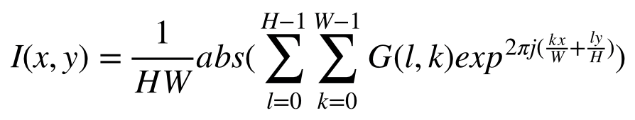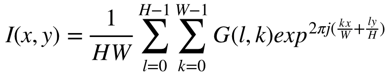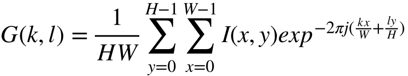 K = [0, W-1], l = [0, H-1], 입력이미지를 I로 한다면, 2차원 이산 푸리에 변환(DFT)는 다음의 식으로 계산된다.