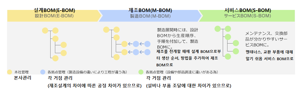 부품은 설계의 BOM (부품표)로 모두 표현 가능하다. 설계 업무에서 작성하는 BOM을 E-BOM이라고 하고, 제품 구성·제품특성(자재, 형태 등) 등 부품의 구성·특성 정보를 모두 갖고 있다. 이 E-BOM은 제조·애프터 서비스에 필요한 정보의 원천이다.