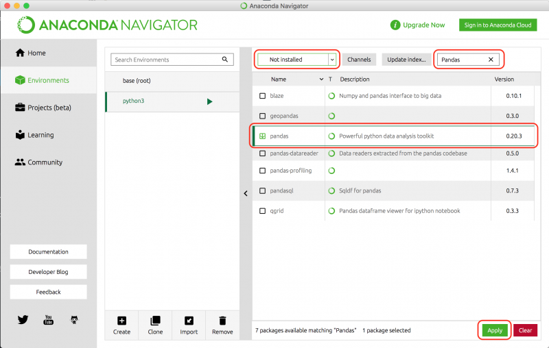 Anaconda에 Pandas를 설치하기 위해서는 메뉴 화면의 Environments의 Not Installed를 선택하여, 검색창에 'Pandas'라고 입력한다. 일련의 Pandas가 표시되므로 체크박스를 선택하여, 화면 좌측 아래의 Apply버튼을 누르는 것만으로도 설치가 가능하다. 그리고 이번에는 설명용으로 scikit-learn의 샘플 데이터 셋을 사용한다. 그러므로 같은 방법으로 scikit-learn, numpy, matplotlib도 설치해두자.