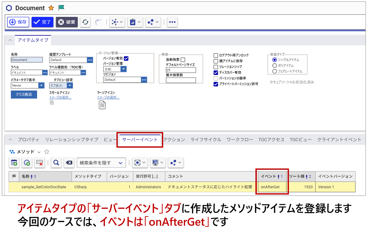 (2) 계속해서 아이템 타입의 "서버 이벤트" 태그에 작성한 메소드를 등록한다. 이번 이벤트는 "onAfterGet"이다.