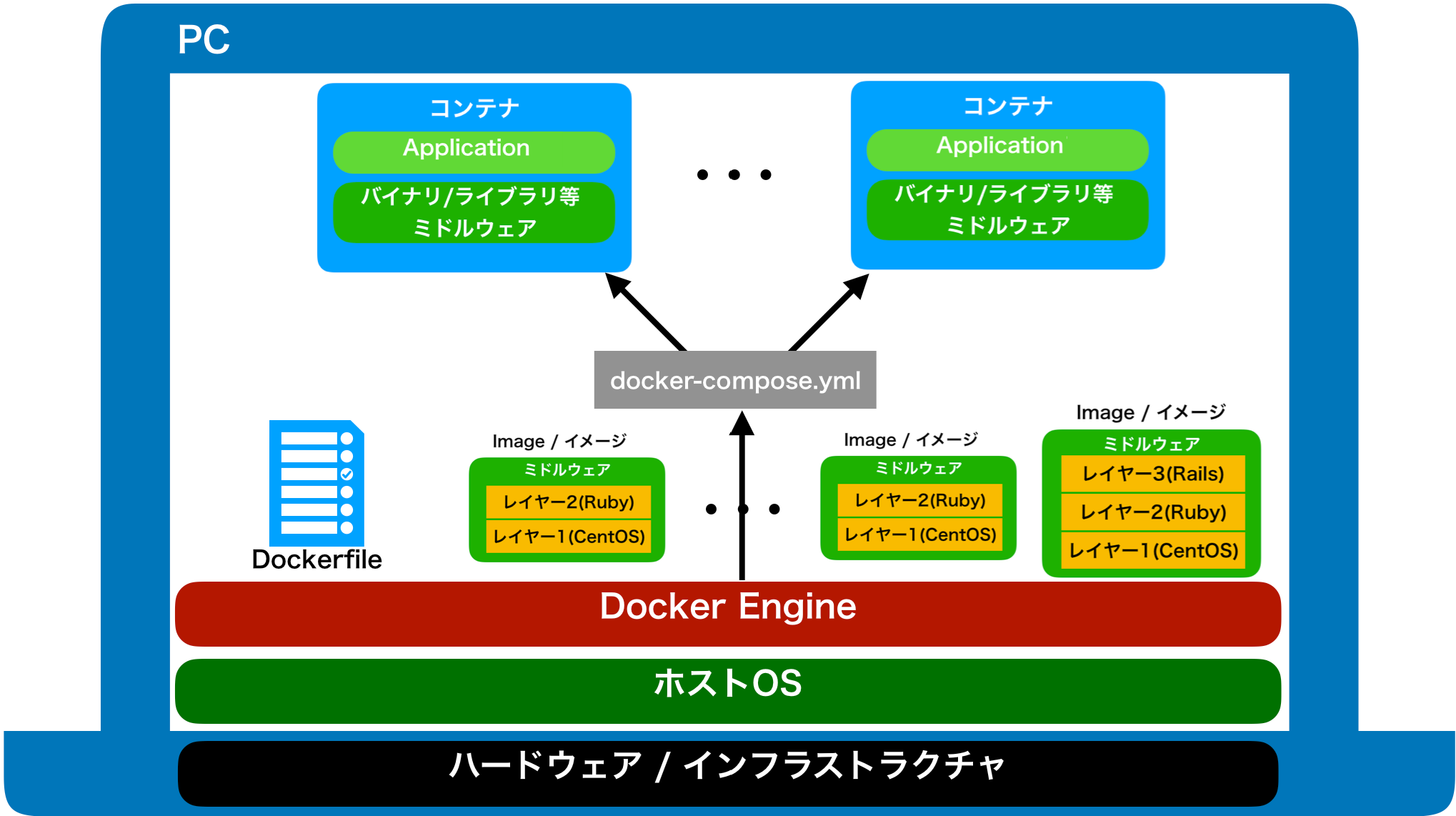 어떤 Web서비스의 실행 환경을 Docekr에 구축하는 경우, Web 서버, DB 서버, Cache 서버 등의 정의를 하나의 docker-compose.yml파일에 기재해 그 파일을 실행하는 것으로 필요한 컨테이너를 한 번에 작동·설정하는 것이 가능하다.
