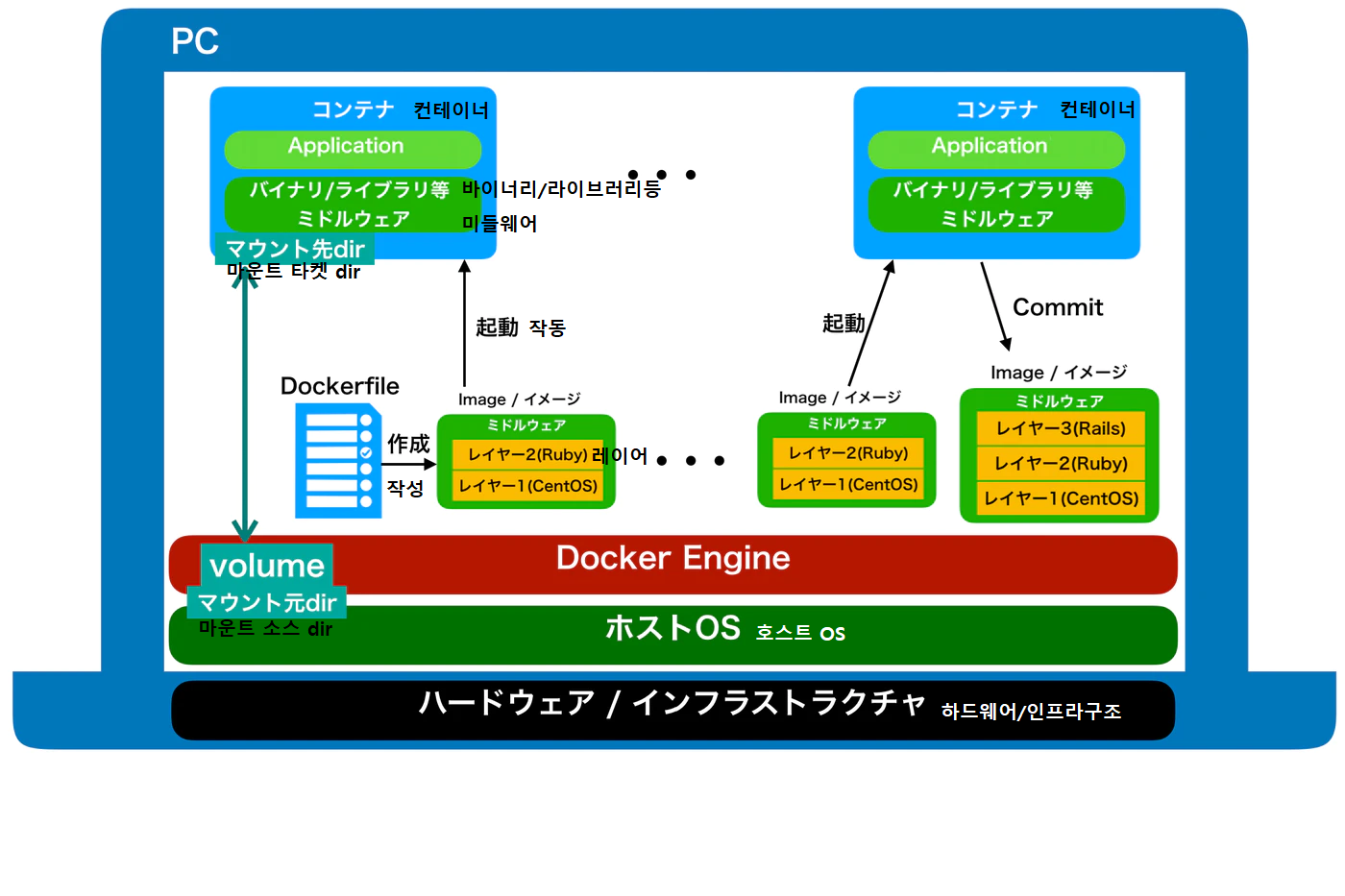 docker run -itd --name [컨테이너명] --mount type=bind,source=[마운트소스디렉터리],target=[마운트타켓디렉토리] イメージ名
