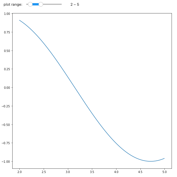 다른 샘플 코드를 하나 더 살펴보자. 여기서는 widgets.IntRangeSlider의 값이 변경된 타이밍에 그래프를 다시 랜더링한다. 또한 앞의 코드와 다른 점은 그려지는 그래프의 사이즈를 키운 것이다.