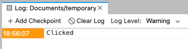이 코드를 실행시켜 버튼을 눌러 보면 생각한대로 바로 Clicked가 출력되지 않는다. 출력 결과는 아래 파란색으로 반짝이는 Log버튼을 눌러보면 그 결과과 아래와 같이 출력된다.
