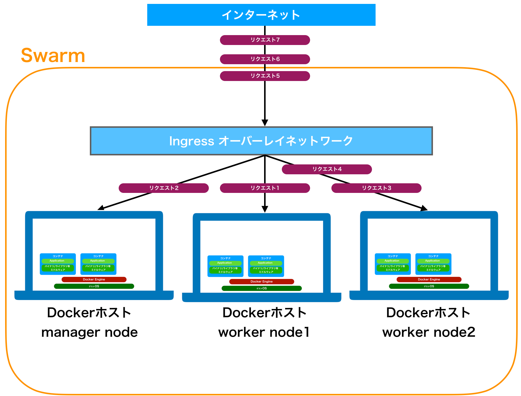 구체적으로는 생성된 Swarm에 Docker호스트머신을 소속시켜, Swarm내의 노드가 된 Docker호스트는 Ingress 오버레이네트워크라는 네트워크로 상호 연결된다.
