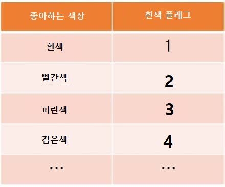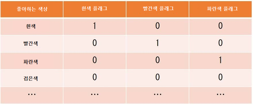 이 때에 새로운 변수로써 "좋아하는 색이 흰색인 플래그', "좋아하는 색이 빨간색인 플래그", "좋아하는 색이 파란색인 플래그"를 작성하여, 해당하면 1, 그렇지 않으면 0을 넣는다. 좋아하는 색이 검은색인 경우에 대해서는 "좋아하는 색이 흰색인 플래그", "좋아하는 색이 빨간색인 플래그", "좋아흐는 색이 파란색인 플래그"가 전부 0인 경우로 표현할 수 있다. 이 방법에서는 변수가 카테고리의 수보다 1개 적은 개수로 나눠지므로 가로가 길고, 대부분 0인 데이터가 된다는 단점이 있다.