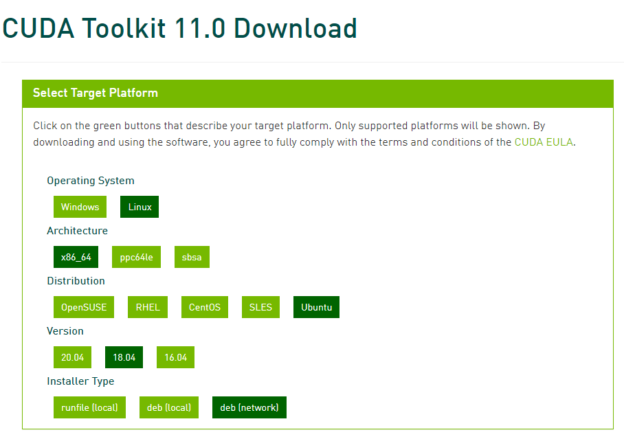 참고로 선택한 버전이 아닌 최신 버전이 설치되는 경우가 있다. 그럴 경우 마지막 sudo apt-get -y install cuda부분에 버전을 지정해주는 것이 좋다. 예를 들어 11.0. 버전을 다운로드하고 싶은 경우 sudo apt-get -y install cuda-11-0 과 같이 수정한 후 커맨드를 실행시킨다.