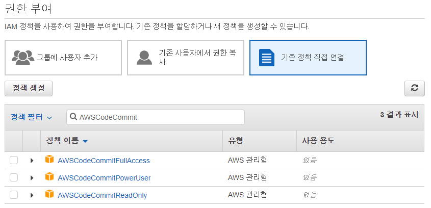 SSH 키를 설정하던 화면에서 "권한 추가"를 클릭한다. 그 다음 세 가지 중 "기존 정책 직접 연결"을 선택한 후 검색창에 "AWSCodeCommit"을 입력한다. 그럼 다음과 같이 세 가지 결과가 출력된다.