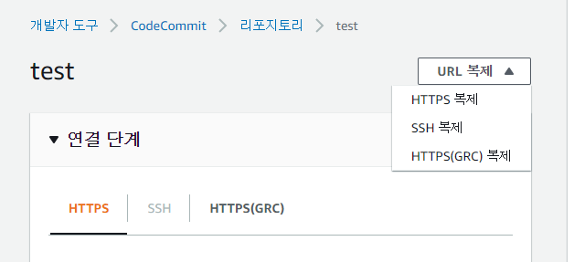 마지막으로 code commit에서 생성한 리포지터리를 선택한 후 ssh 복제를 선택하거나 아래의 SSH 탭을 선택하면 나타나는 커맨드를 복사해서 입력하면 git clone이 된다.