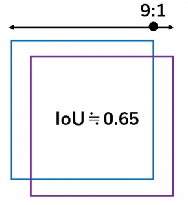 IoU는 엄격한 평가지표이다. 동일한 정사각형을 비스듬히 아래와 같이 9분의 1 어긋나게 설정된 경우에도, IoU는 64/98로 0.65가 된다.