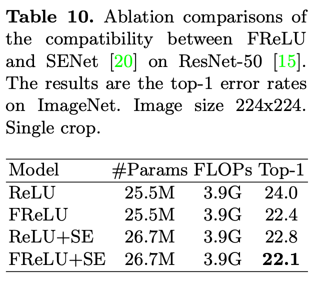 FReLU를 실제로 사용할 때에 문제가 되는 것이, 과연 어떤 Convolution에 FReLU를 사용할 것인가이다. 더욱이 SENet등과 같이 기존의 방법과의 상성이 좋은지를 살펴볼 필요가 있다.