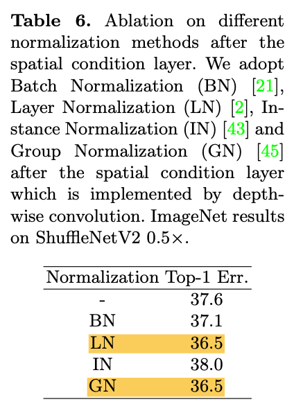 한편으로, 구현에서도 Funnel Condition 직후에 배치 노말을 넣지만, 그 곳을 다른 레이어 Norm / 인스턴스 Norm/ 그룹 Norm을 넣은 경우 어떻게 될지를 실험해본 결과 표이다. 모델은 ShuffleNetV2로 여기서도 ImageNet의 이미지 분류이다. 레이어 Norm과 그룹 Norm에서 좋은 결과를 나타내고 있지만, 그렇다면 이 논문에서는 왜 배치 Norm을 일관적으로 사용하였을까. 그 이유를 필자에게 물어보니, 추론시간이 배치 Norm이 빨랐기 때문이라는 답변을 받았다.