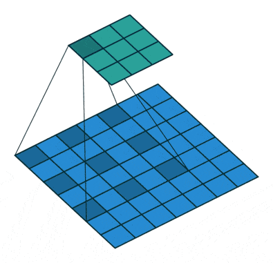 공간적 의존성을 학습시키는 것을 어려우므로, 효율성을 희생한 Dilated Convolution(Atrous Convolution)등이 제안됐다. Dilated Convolution은 그 이름 그대로 보통의 Convolution을 팽창한 것과 같은 Convolution이 되어, 아래와 그림과 같이 표현된다. PyTorch에서는 nn.Conv2d에 dilation인수가 준비되어 있으며, 기본적으로는 dilation=1으로 설정되어 있다(아래의 그림은 dilation=2일때의 모습).
