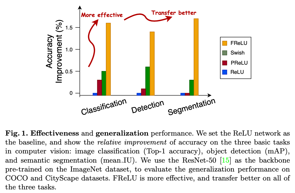 - FReLU는 이미지 분류 / 물체인식/ 시멘틱 세그멘테이션 모델에서 성능이 향상된 것을 확인할 수 있었다.