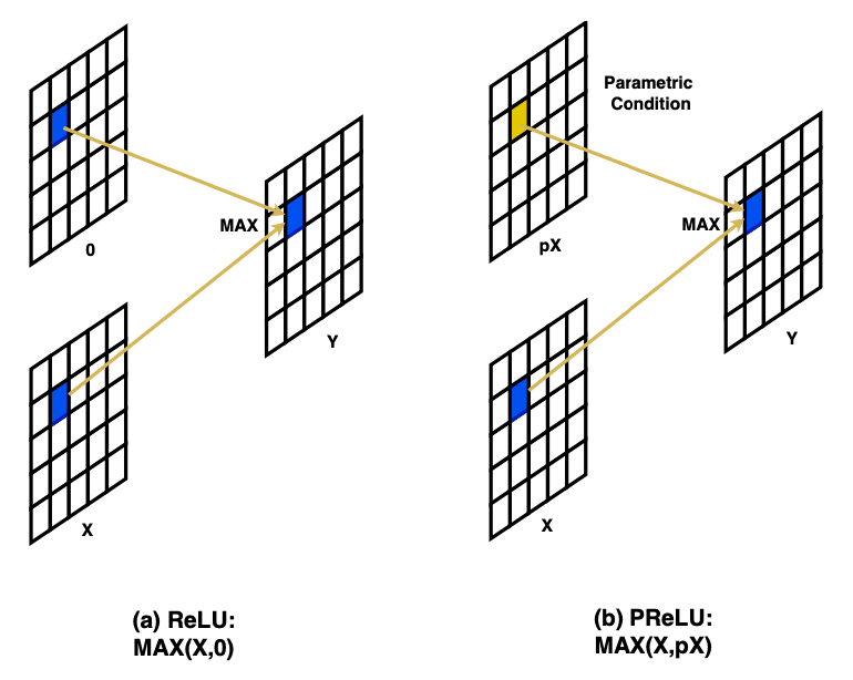 여기서 발전된 것이 오른쪽의 PReLU이다. 식은 max(x,0)+p⋅min(x,0)이다. PReLU는 ReLU의 단점인 기울기를 0으로 하는 것이 아닌 학습 가능한 파라미터 p로 결정한다는 것이다(초기값p=0.25). 여기서 파라미터 p는 convolution의 각 채널 각각에 독립하여 존재한다.