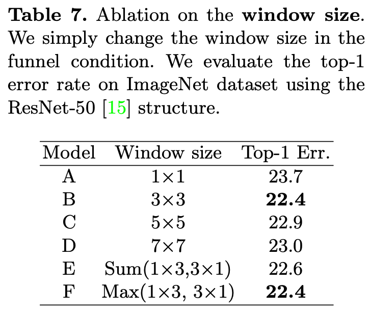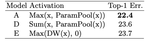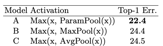 먼저, FReLU에서는 공간적 의존성을 획득하기 위해서는 Funnel Conditon(즉 Depthwise Convolution)을 이용하지만, 애초부터 파라미터가 필요할까? 여기서는 Funnel Condition의 대신에 Max Pooling/Average Pooling을 이용해봤다. 모델은 ResNet-50로 위 표가 Image Net의 결과이다. 명확히 파라미터를 포함한 Funnel Condition가 제일 좋은 결과를 나타내고 있다.