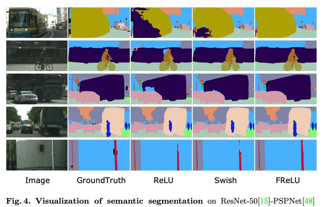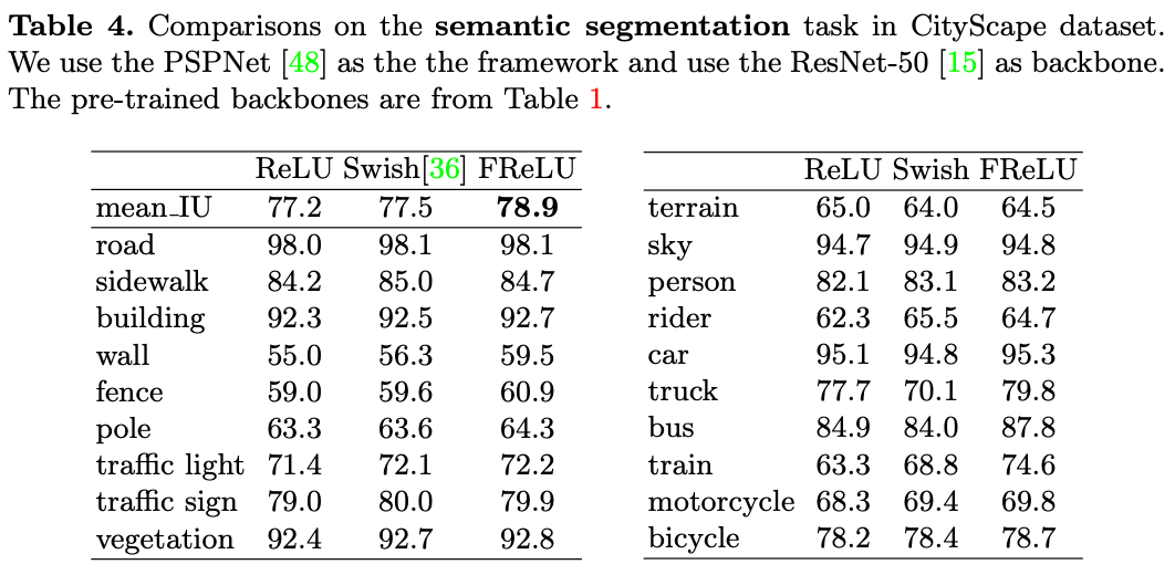 위 표를 살펴보면, FReLU가 mean_IU가 최고의 성능을 보여주고 있음을 알 수 있다. 또한 클래스마다 살펴보면 train, bus, wall 등 큰 폭으로 성능이 향상됐음을 알 수 있다.