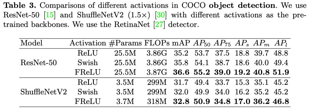 위 표가 실험 결과이다. 특히, ResNet-50를 백 본으로 이용했을 때에는 FReLU가 ReLU/Swish에 비해 mAP에서 각각 1.4%/0.8%정도 이기고 있다는 것을 알 수 있다. 그 외에도 성능향상의 결과가 나타났음을 알 수 있다.
