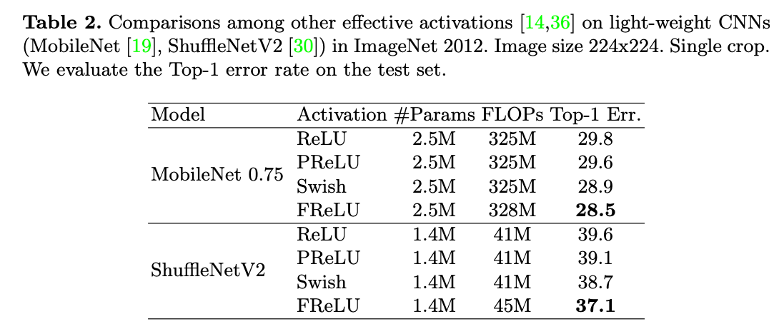 계속해서 경량 모델에서 그 결과를 살펴보자. 여기서는 MobileNet0.75(일반적인 MovileNet보다도 폭(=채널 수)이 적은 모델)과 ShuffleNetV2를 사용하였다. 위 표의 결과를 살펴보면, FReLU가 제일 낮은 에러율을 보여주고 있다. ShuffleNetV2에 있어서는 ReLU와 비교하여 2.5%성능 향상을 보여주고 있다. 여기서도 물론 계산량의 문제가 없었다.