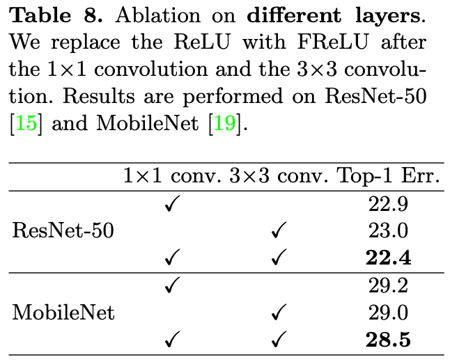 먼저 어떤 Convolution 뒤에 FReLU를 넣어야 할 것인가에 대한 것이다. 여깃서는 1x1 Convolution 직후, 3x3 Convolution의 직후, 양쪽의 패턴으로 실험해봤다. 여기서 3x3 Convolution의 직후를 실험해보는 것은 알겠는데, 1x1 Convolution의 직후는 왜 실험해보는 것을까라고 의문을 가질 수 있을 거라고 생각한다. 이것은 ResNet-50은 Bottleneck 모듈 내에서 Mobilenet은 Depthwise Separable Convolution에서 1x1 Convolution을 사용하고 있기 때문이다. 위 표를 살펴 보면, 1x1 Conv 및 3x3 Conv 각각의 직후에 FReLU를 사용하는 것이 베스트라는 것을 알 수 있다.