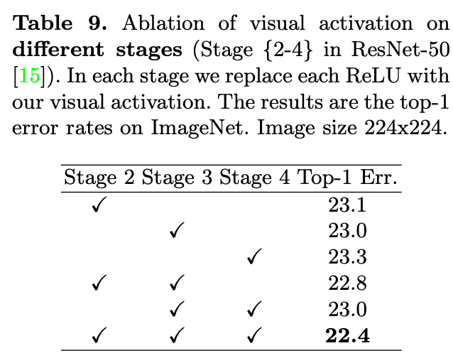 더욱이, ResNet-50의 어떤 Stage에서 FReLU를 사용해야 베스트일까를 알아보았다. 이 논문에서 말하는 Stage는 위의 ResNet-50의 구조의 'layer_name'에 대응한다. conv1는 stage 1로 conv2_x가 stage2 라는 방식이다. 결과는 아래의 표와 같다. stage 5는 이미지 사이즈가 7x7로 작기 때문에 여기서는 고려하지 않는다. 모든 stage(2-4)에 FReLU을 넣는 것이 베스트임을 알 수 있다.