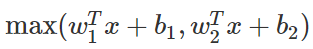 스칼라 값 활성화 함수가 1개의 뉴런에만 의존하는 것에 반해, 문맥 조건적 활성화 함수 (= contextual conditional activation)는 다대일의 함수이다. 즉, 여러 개의 뉴런에 의존하는 함수이다. 대표적인 것이 Maxout(클릭시, 해당 논문으로 이동)이라고 불리는 것으로, 식은 아래와 같다.