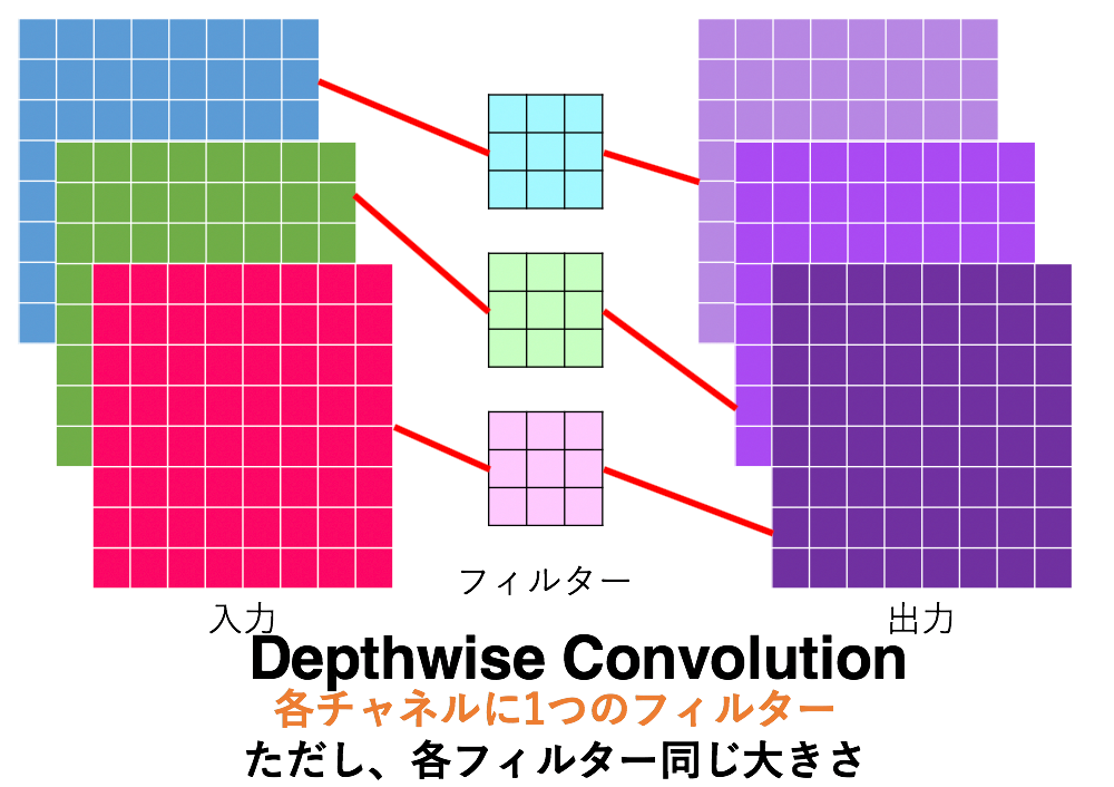 Depthwise Convolution은 단순히 입력의 각 채널에 1개의 필터가 있는 Convolution을 이용해, 파라미터의 수가 대폭 줄어들게 되므로 모바일계의 CNN모델에서 자주 사용되는 Convolution이다. 한편, PyTorch에서는 Conv2d의 groups인수를 채널 수와 동일하게 하는 것으로 Depthwise Convolution을 구현하 수 있다. 아래는 예시코드이다.