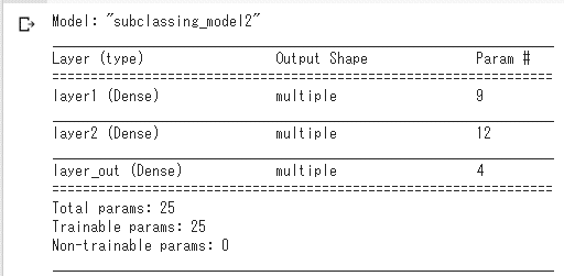모델의 생성시에 인수 name에 지정했던 이름은 반영되었음을 알 수 있으나 두 번째의 방법에서도 모델의 구성도를 제대로 출력하고 있지 않다는 것을 알 수 있다. Subclassing모델의 기본 기능에서는 이러한 제약이 있다.