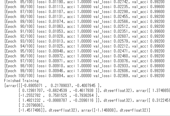 이러한 것을 사용하여, 에포크마다 먼저 매트릭스 값을 초기화하고, 모든 배치를 처리 한 후에 매트릭스 값을 취득하고, 그 내용을 print()함수로 출력한 결과는 아래와 같다.