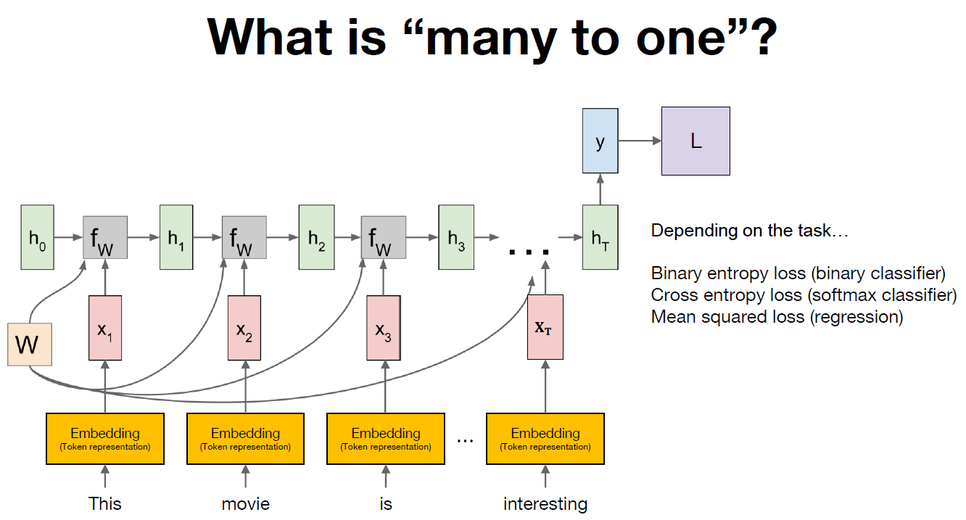이번에 다룰 Many to one은 특히 자연어 처리 분야에서 어떤 문장, 또는 단어를 RNN으로 인코딩하고 해당 문장 또는 단어의 sentiment를 classification하는 데 활용할 수 있다.