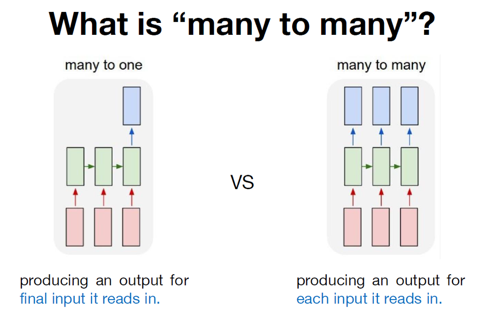 이전에 다뤘던 many to one의 경우 RNN이 시퀀스를 구성하고 있는 각각의 토큰을 읽어들이면서 시퀀스의 마지막에 해당하는 토큰을 읽었을 때 출력을 내는 구조였다. 이와는 다르게 many to many는 RNN이 시퀀스를 구성하고 있는 각각의 토큰에 대해서 모두 출력을 하는 구조이다.